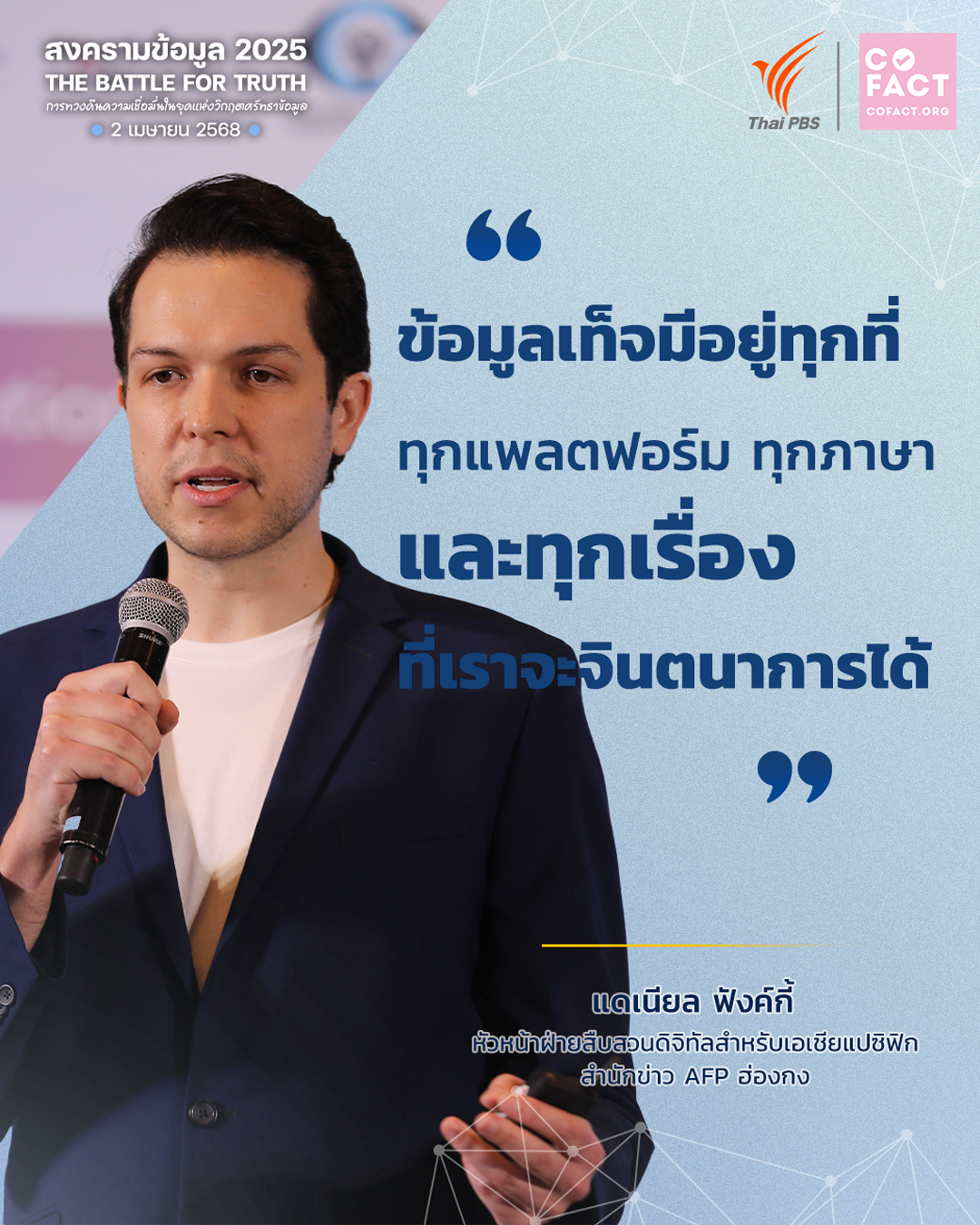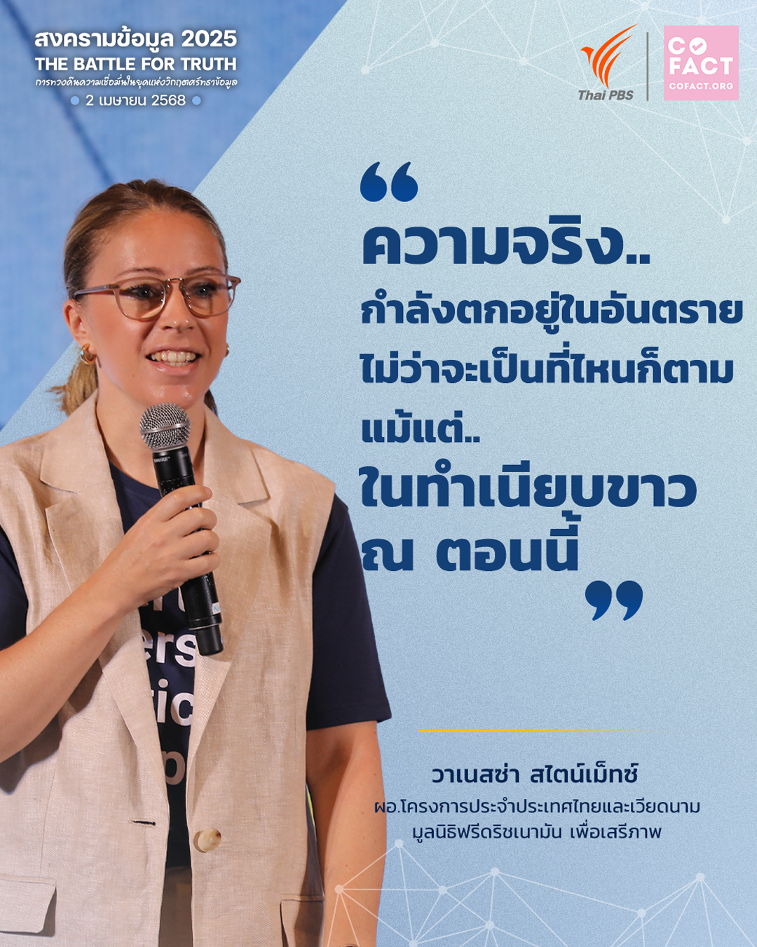 ไทยพีบีเอส ร่วมเป็นหนึ่งในภาคีสำคัญของงาน “สงครามข้อมูล 2025: โจทย์แห่งความจริงในยุควิกฤตความเชื่อมั่น” แลกเปลี่ยนแนวคิดและยุทธศาสตร์ในการรับมือกับข้อมูลบิดเบือนที่แพร่กระจายอย่างรวดเร็วและมีความซับซ้อนยิ่งขึ้นในยุคดิจิทัล พร้อมเปิดตัว “Thai PBS Verify” ช่วยเสริมสร้างทักษะ ความรู้เท่าทันสื่อให้กับประชาชน