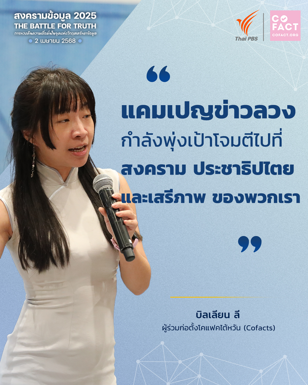 บิลเลียน ลี ผู้ร่วมก่อตั้งโคแฟคไต้หวัน (Cofact Taiwan) กล่าวเล่าถึง การร่วมมือกับชุมชนชาวไต้หวัน เพื่อสร้างความเข้าใจเกี่ยวกับการต่อสู้กับข้อมูลบิดเบือนผ่านการใช้เทคโนโลยี ซึ่งได้มีการสร้างแพลตฟอร์มที่สามารถเชื่อมโยงผู้ใช้ทั่วไปกับผู้เชี่ยวชาญในการตรวจสอบข้อเท็จจริงได้อย่างมีประสิทธิภาพ และยังคงเน้นย้ำถึงความสำคัญของการสร้างความตระหนักรู้ ในหมู่ประชาชนในการตรวจสอบข้อเท็จจริงของข้อมูลข่าวสาร