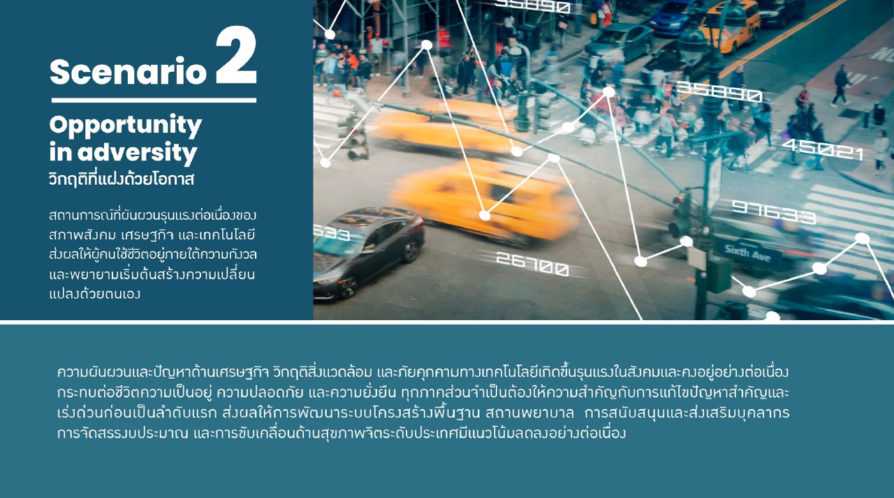 ฉากทัศน์ “วิกฤติที่แฝงด้วยโอกาส” (Opportunity in adversity) สถานการณ์ที่ผันผวนรุนแรงต่อเนื่องของสภาพสังคม เศรษฐกิจ และเทคโนโลยี ส่งผลให้ผู้คนใช้ชีวิตอยู่ภายใต้ความกังวล และพยายามเริ่มต้นสร้างความเปลี่ยนแปลงด้วยตนเอง
