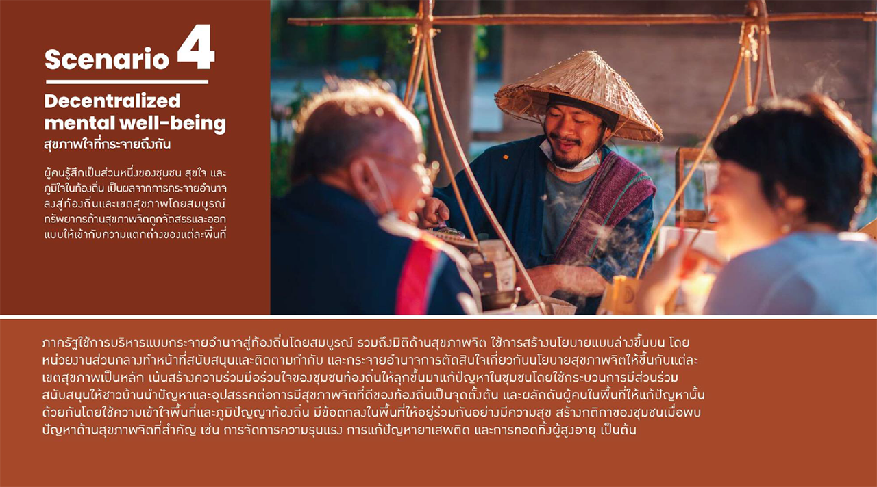 ฉากทัศน์ “สุขภาพใจที่กระจายถึงกัน” (Decentralized mental well-being) ผู้คนรู้สึกสุขใจ เป็นส่วนหนึ่งของชุมชน เป็นผลจากการกระจายอำนาจลงสู่ท้องถิ่น ทรัพยากรด้านสุขภาพจิตถูกจัดสรรและออกแบบให้เข้ากับความแตกต่างของแต่ละพื้นที่