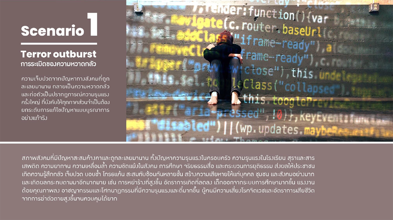 โดย 5 ฉากทัศน์จากงานวิจัยอนาคตสุขภาพจิตสังคมไทย เป็นการคาดการณ์ถึงอนาคตของสังคมไทยในอีก 10 ปีข้างหน้า ตั้งแต่ที่เลวร้ายที่สุด คือ ฉากทัศน์ “การระเบิดของความกลัว” (Terror outburst) สภาพสังคมที่มีปัญหาสะสมและถูกละเลยมานาน วางผลให้ประชาชนเกิดความหวาดกลัว เจ็บปวด บอบช้ำ สะสมทับซ้อนกันหลายชั้น และก่อตัวเป็นปรากฏการณ์ความรุนแรงครั้งใหญ่