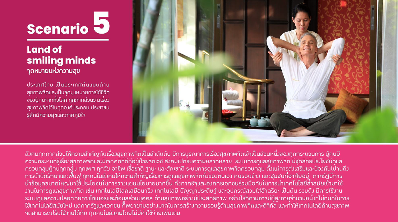 และ ฉากทัศน์ “จุดหมายแห่งความสุข” (Land of smiling minds) ประเทศไทย เป็นประเทศต้นแบบด้านสุขภาพจิต และเป็นจุดมุ่งหมายการใช้ชีวิตของผู้คนจากทั่วโลก ทุกภาคส่วนวางเรื่องสุขภาพจิตไว้ในทุกองค์ประกอบ ประชาชน รู้สึกมีความสุขและภาคภูมิใจ