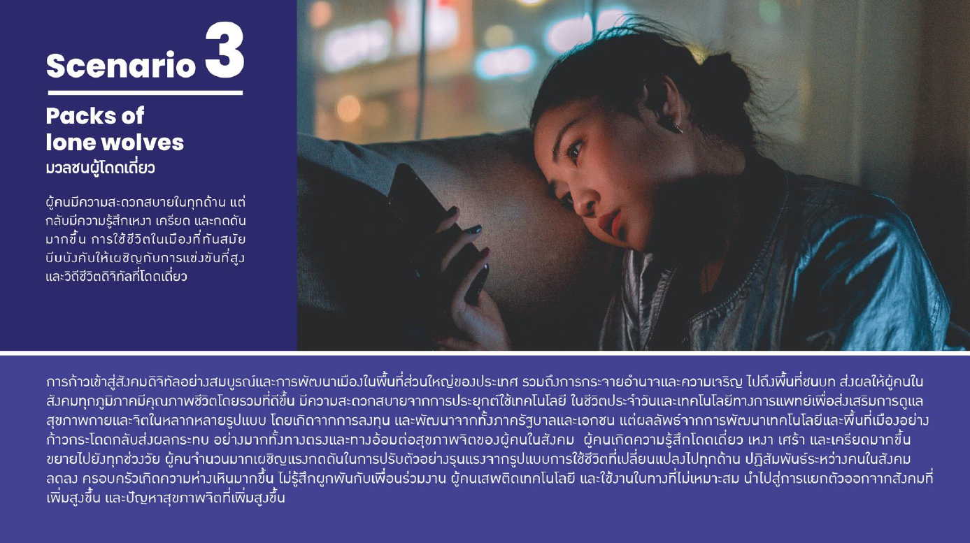 ฉากทัศน์ “มวลชนผู้โดดเดี่ยว” (Packs of lone wolves) ผู้คนมีความสะดวกสบายในทุกด้าน แต่กลับมามีความรู้สึกเหงา เครียด และกดดันมากขึ้น การใช้ชีวิตในเมืองที่ทันสมัย บีบบังคับให้เผชิญกับการแข่งขันที่สูงและวิถีชีวิตดิจิทัลที่โดดเดี่ยว