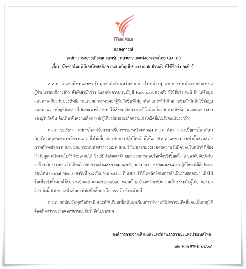 ส.ส.ท. ต้องขอโทษและขอรับทุกคำติเตียนหรือคำกล่าวโทษต่างๆ จากการที่พนักงานตำแหน่งผู้ช่วยบรรณาธิการข่าว สังกัดสำนักข่าว โพสต์ข้อความบนบัญชี Facebook ส่วนตัว ที่ใช้ชื่อว่า กะทิ จ้า ให้ข้อมูลและภาพเกี่ยวกับประสิทธิภาพและผลกระทบของผู้รับวัคซีนที่ไม่ถูกต้อง และทำให้สื่อมวลชนสังกัดอื่นใช้ข้อมูลและภาพจากบัญชีดังกล่าวไปเผยแพร่ซ้ำ จนทำให้สังคมเกิดความเข้าใจผิดเกี่ยวกับประสิทธิภาพและผลกระทบของผู้รับวัคซีน อันนำมาซึ่งความเสียหายต่อผู้เกี่ยวข้องและเกิดความเข้าใจผิดขึ้นในสังคมเป็นวงกว้าง