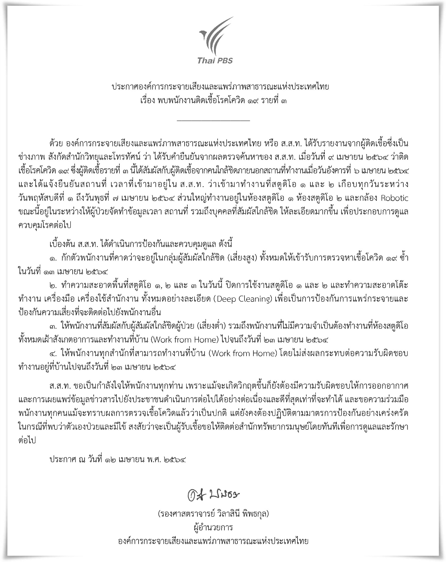องค์การกระจายเสียงและแพร่ภาพสาธารณะแห่งประเทศไทย (ส.ส.ท.) หรือ ไทยพีบีเอส ประกาศพบพนักงานติดเชื้อ COVID-19 เป็นคนที่ 3 ซึ่งเป็นช่างภาพ สังกัดสำนักโทรทัศน์และวิทยุของไทยพีบีเอส โดยผู้ติดเชื้อได้รับการตรวจคัดกรองค้นหาผู้ติดเชื้อ COVID-19 ของไทยพีบีเอส ไปเมื่อวันที่ 9 เมษายน 2564 และได้รับผลยืนยันว่าติดเชื้อ ทั้งนี้ ผู้ติดเชื้อคนที่ 3 นี้ได้สัมผัสกับผู้ติดเชื้อจากคนใกล้ชิดภายนอกไทยพีบีเอสไปเมื่อวันที่ 6 เมษายน 2564