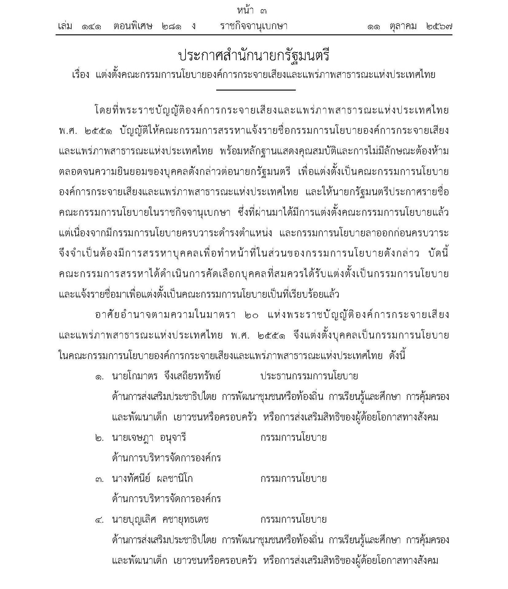 ประกาศสำนักนายกรัฐมนตรี เรื่อง แต่งตั้งคณะกรรมการนโยบายองค์การกระจายเสียงและแพร่ภาพสาธารณะแห่งประเทศไทย