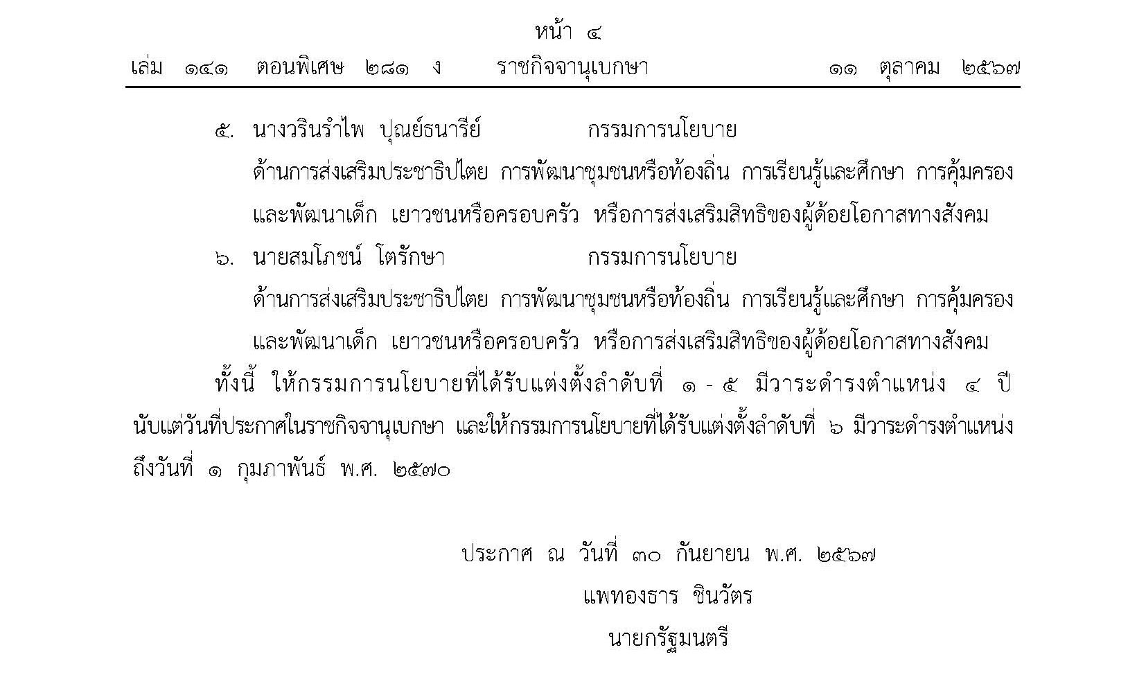 ทั้งนี้ ให้กรรมการนโยบายที่ได้รับแต่งตั้งลำดับที่ 1 – 5 มีวาระการดำรงตำแหน่ง 4 ปี นับแต่วันที่ประกาศในราชกิจจานุเบกษา และให้กรรมการนโยบายที่ได้รับแต่งตั้งลำดับที่ 6 มีวาระดำรงตำแหน่งถึงวันที่ 1 กุมภาพันธ์ พ.ศ.2570