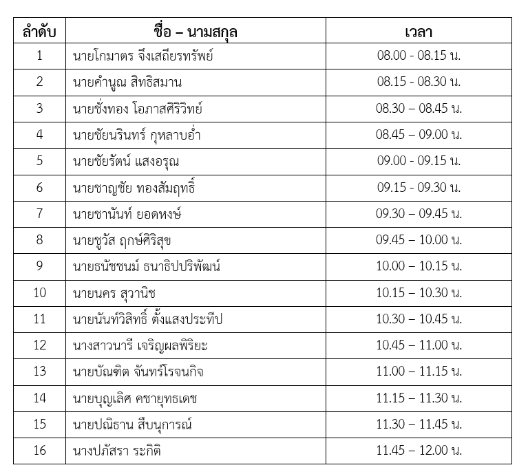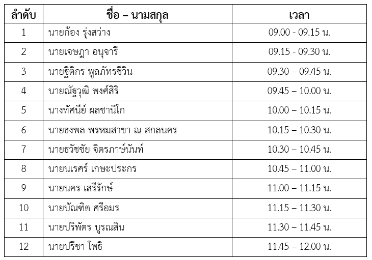 1. ด้านการส่งเสริมประชาธิปไตย การพัฒนาชุมชนหรือท้องถิ่น การเรียนรู้และศึกษา การคุ้มครองและพัฒนาเด็ก เยาวชนหรือครอบครัว หรือการส่งเสริมสิทธิของผู้ด้อยโอกาสทางสังคม กำหนดแสดงวิสัยทัศน์ ในวันพฤหัสบดีที่ 1 สิงหาคม พ.ศ. 2567 เรียงตามลำดับในช่วงเวลาที่ระบุข้างต้น หรือตามความเหมาะสม และด้านการบริหารจัดการองค์กร กำหนดแสดงวิสัยทัศน์ ในวันศุกร์ที่ 2 สิงหาคม พ.ศ. 2567 เรียงตามลำดับในช่วงเวลาที่ระบุข้างต้น หรือตามความเหมาะสม