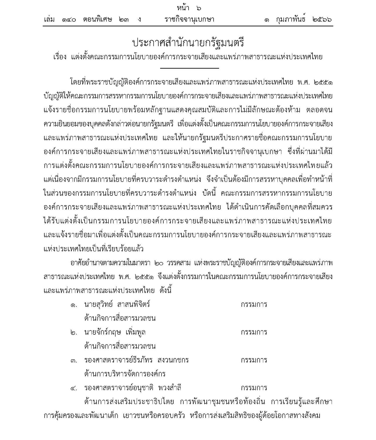 ราชกิจจาฯ เผยแพร่ประกาศ “แต่งตั้ง 4 กรรมการนโยบายไทยพีบีเอส”