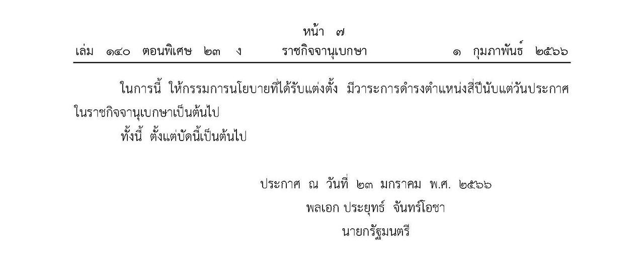 ในการนี้ ให้กรรมการนโยบายที่ได้รับแต่งตั้ง มีวาระการดำรงตำแหน่งสี่ปีนับแต่วันประกาศในราชกิจจานุเบกษาเป็นต้นไป
